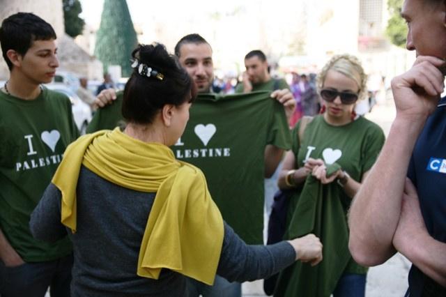وزع عدد من النشطاء الفلسطينيين صباح اليوم الخميس، قمصان كتب عليها "أنا أحب فلسطين" كهدية للسياح الوافدين إلى المدينة للتأكيد على فلسطينية المدينة وأنها ليست منطقة اسرائيلية كما يدعي الاحتلال.