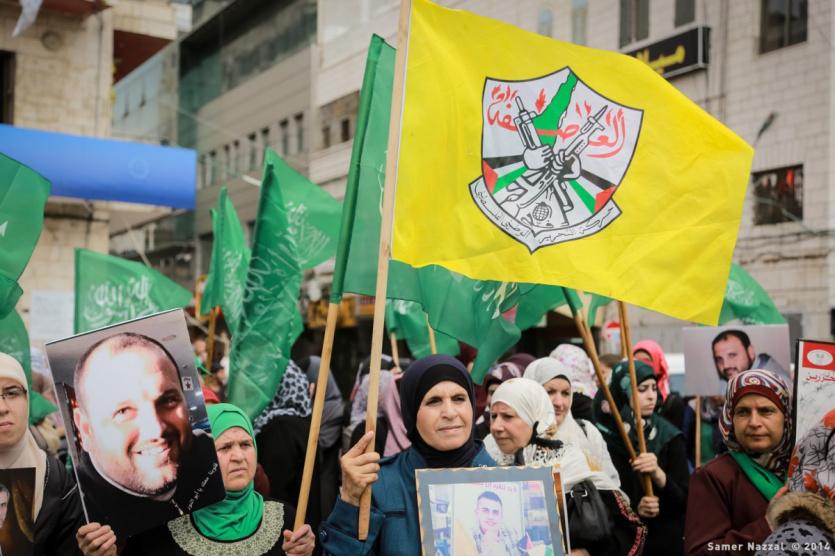 رايات فتح تعانق رايات حماس وسط رام الله خلال فعالية مساندة للأسرى المضربين عن الطعام