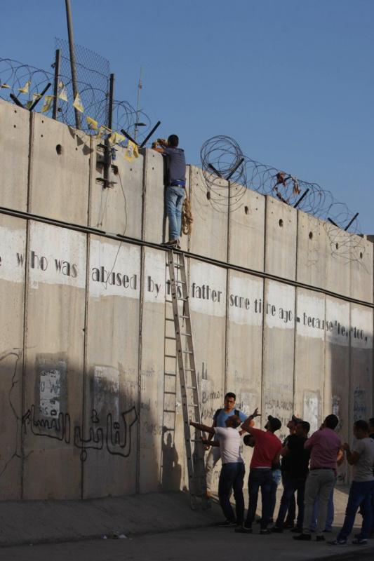 شبان يتسلقون جدار الفصل العنصري صباح اليوم لأداء صلاة الجمعة الأولى من رمضان في المسجد الاقصى