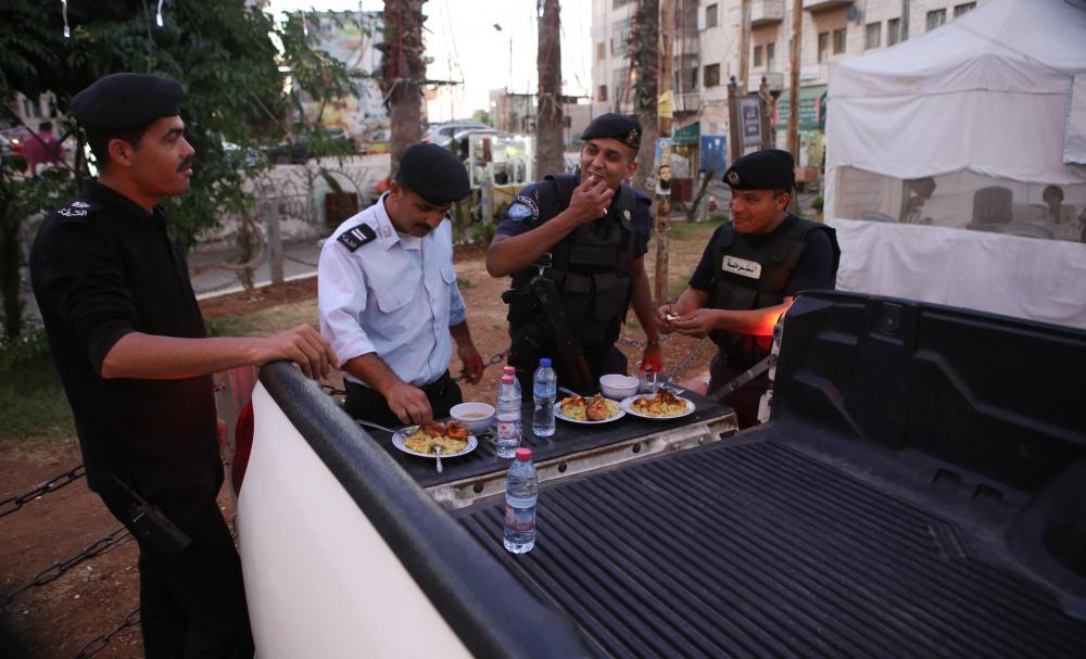 افراد من الشرطة يتناولون افطارهم وسط رام الله