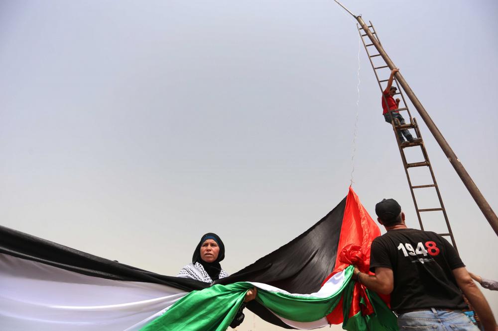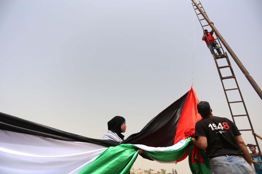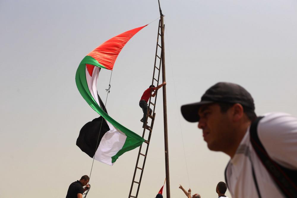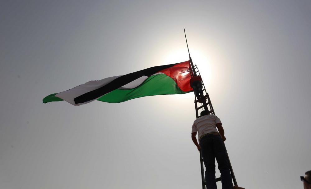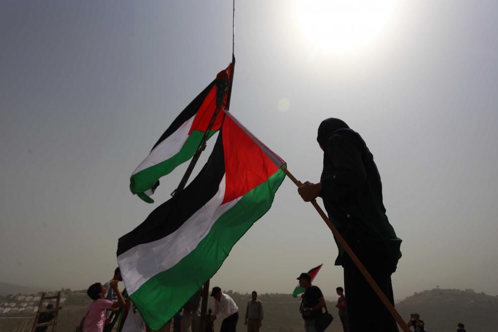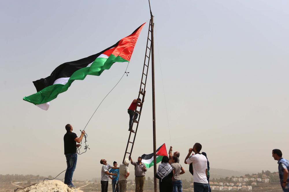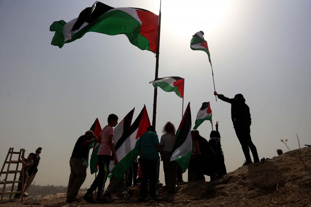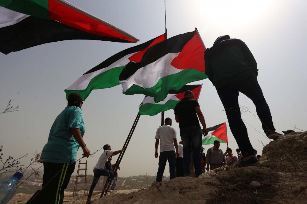 فلسطينيون يرفعون العلم الفلسطيني خلال تظاهرة ضد الاستيطان في قرية النبي صالح