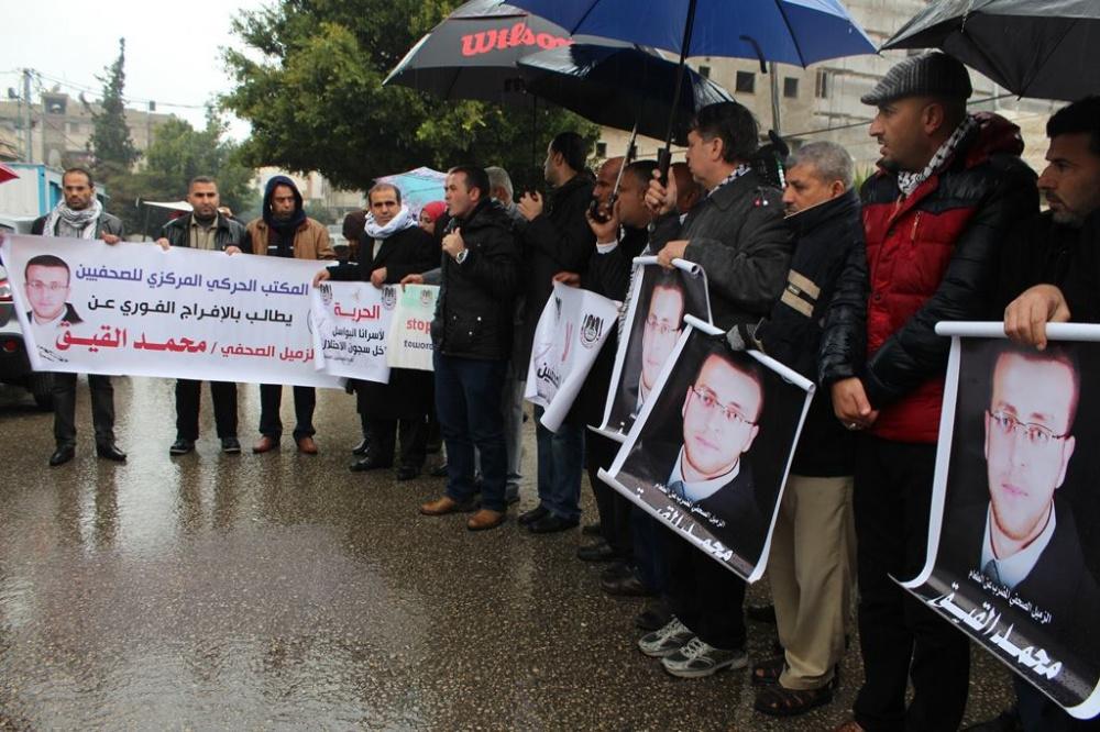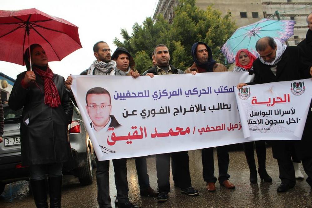 نظمت نقابة الصحفيين في قطاع غزة اليوم الاربعاء، اعتصام تضامني امام مقر المندوب السامي للمطالبة بالافراج عن الأسير الصحفي محمد القيق المضرب عن الطعام في سجون الاحتلال منذ 64 يوما.