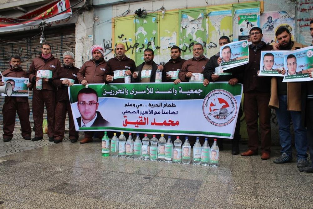 أطلقت جمعية واعد للأسرى والمحررين بغزة مساء اليوم الأربعاء، حملة توزيع "طعام الحرية مي وملح" لتوعية المواطنين والتضامن مع الأسير المضرب عن الطعام محمد القيق، سبقها وقفة تضامنية بحضور أسرى محررين، حيث ارتدى المشاركون ملابس الأسرى في سجون الاحتلال وقاموا بتوزيع الماء والملح على المواطنين.