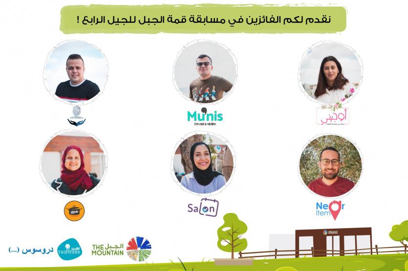 فاز 6 رياديات ورياديون يوم السبت، الثاني من تشرين الأول 2021 بجائزة وتمويل حاضنة أعمال الجبل بدعم وشراكة مع مؤسسة دروسوس السويسرية وذلك ضمن مسابقة "قمة الجبل" التي تم عقدها في مقر الحاضنة وسط الطبيعة الفلسطينية بمشاركة 15ريادية وريادياً ممن تمكنوا من الوصول لنهاية "برنامج الجبل لريادية الأعمال" من أصل 25 بدأوا رحلتهم في عالم ريادة الأعمال منذ شهر أيار 2021.