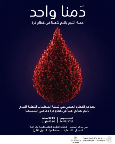 من المقرر ان تطلق شبكة المنظمات الاهلية الفلسطينية حملة للتبرع بالدم لصالح مرضى الثلاسيميا والمرضى في قطاع غزة ليوم واحد تحت عنوان "دمنا واحد" استجابة للوضع الكارثي المتهدور للمنظومة الصحية الذي يشهده قطاع غزة مع استمرار استهداف المشافي والمراكز الطبية، والتحذرات لعدد كبير من المؤسسات الدولية والانسانية من انهيار القطاع الصحي في القطاع وتوقف العديد من الاقسام عن العمل في المشافي المتبقية بسبب عدم ادخال الوقود، ونقص الامكانيات خصوصا للامراض المزمنة، وغسيل الكلى، الاطفال، والنساء على وشك الولادة اضافة الى وجود اعداد كبيرة من الجرحى دون تلقي العلاج اللازم الامر الذي ينذر بكارثة محدقة جراء السياسات الاسرائيلية .
