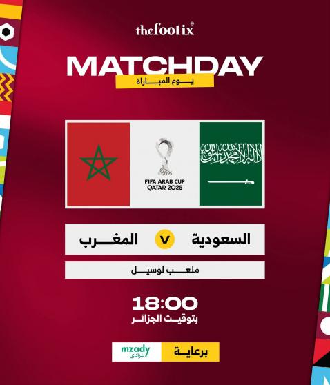 يمكنك متابعة رابط مشاهدة مباراة السعودية والمغرب بث مباشر اليوم في بطولة كأس العرب 2025 عبر القنوات والمنصات الرسمية، والاستمتاع بواحدة من أجمل مباريات البطولة التي تجمع بين المهارة والقوة والطموح العربي المشترك نحو المجد الكروي.