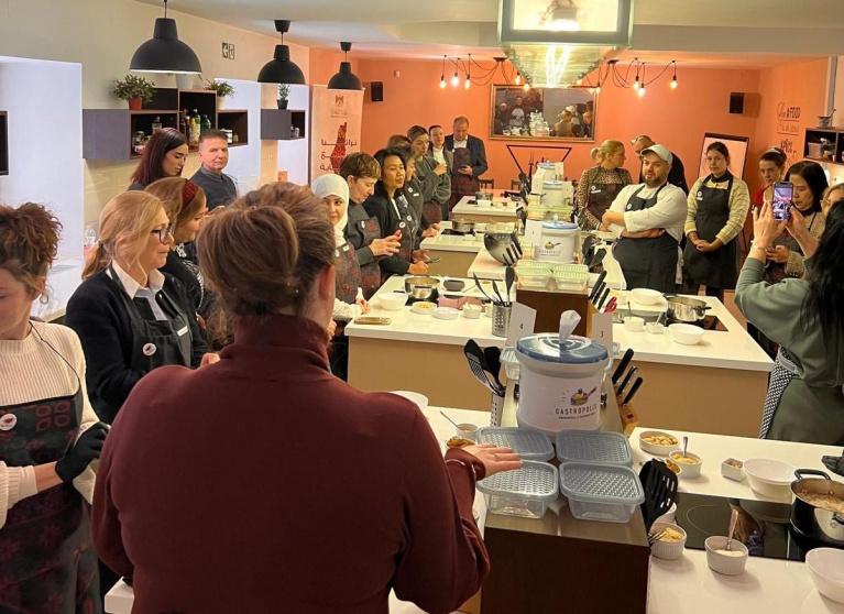 وانتقل المشاركون عقب ذلك إلى الجانب التطبيقي، حيث استمعوا لإرشادات روان أبو زرقا، قبل أن يباشروا تحضير البربارة بأنفسهم، وهم يرتدون أزياء تحمل لمسة فلسطينية وعلى أنغام الموسيقى الفلكلورية، تحت إشراف الشيف يحيى خضارو، أحد أمهر الطهاة في بودابست.
