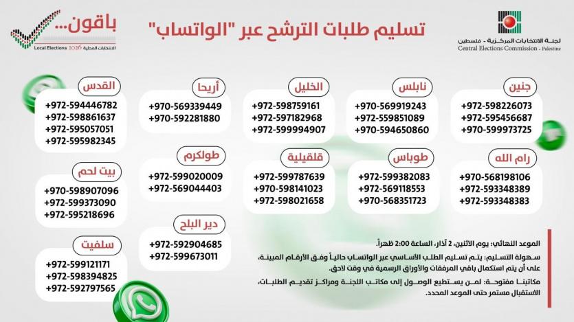 أعلنت لجنة الانتخابات المركزية، مساء اليوم السبت، تمديد فترة الترشح 24 ساعة إضافية ليصبح الموعد النهائي لتسليم طلبات الترشح الساعة الثانية من ظهر يوم الاثنين الموافق 2 آذار، وبنفس الآلية المعلنة مسبقا: إما بالحضور شخصيا إلى مكاتب اللجنة، أو إرسال طلب الترشح من خلال أرقام "الواتس آب" المعلن عنها في جميع المحافظات في الضفة الغربية وفي مدينة دير البلح.