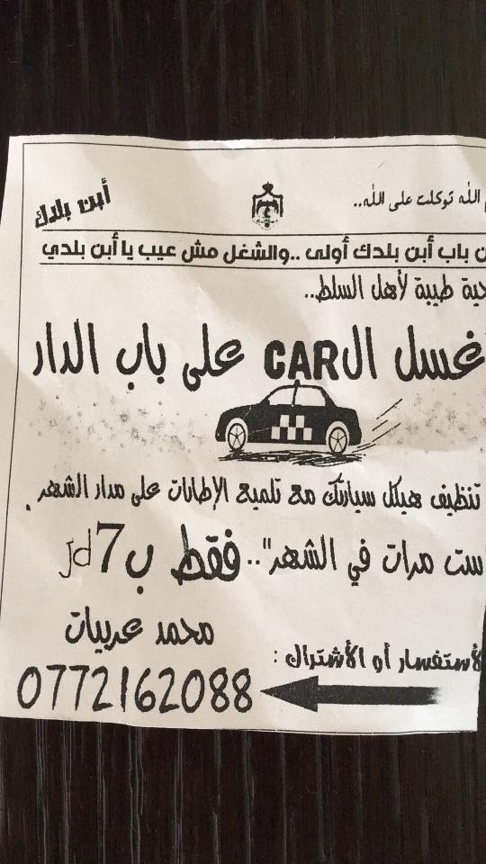 "اغسل الكار على باب الدار" فكرة الشاب "عربيات" الحاصل على بكالوريوس في علم الاجتماع من الجامعة الاردنية والتي تتمثل في "ديليفري" غسيل سيارات على باب البيت او مكان العمل او في اي مكان يختاره الزبون داخل الاردن.
