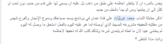 ولعل محمد عربيات أراد ان يقول للعالم بأن لاحلم مستحيل وان الالتفات الى الخلف لايفيد افعل ما تراه صحيحا انت ليس ما يراه الجميع صحيحا.