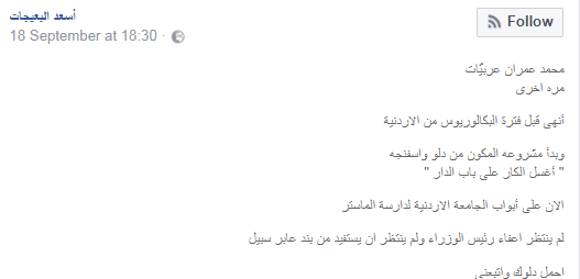 بعد عام من العمل في تطبيق فكرته الريادية استطاع محمد عربيات ان يحقق حلمه في ان يدرس الماجستير على نفقته الخاصة لتنتشر صورته في اول يوم دراسي بدرجة الماجستير على حسابات التواصل الاجتماعي الاردنية كالنار في الهشيم تشجيعا للشاب الذين رؤوا فيه فخرا للأردن ومثالا للشاب الطموح والناجح.