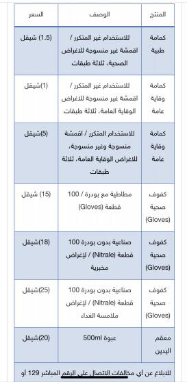 حددت وزارتا الاقتصاد الوطني والصحة، اليوم الثلاثاء، قائمة السقف السعري الاعلى للكمامات والكفوف الصحية ومعقم اليدين، المعتمدة من قبل مؤسسة المواصفات والمقاييس الفلسطينية.