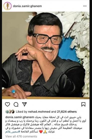 نشرت الفنانة دنيا سمير غانم في الذكرى الأولى لوفاة والدها الفنان الكبير سمير غانم تدوينة عبرت من خلالها عن اشتياقها وحبها له.