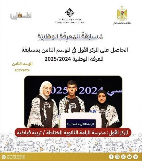 حصلت مدرسة الرامة الثانوية المختلطة من تربية قباطية على المركز الأول في مسابقة المعرفة الوطنية في موسمها الثامن 2024/2025 في الحلقة الختامية التي جرت اليوم الأحد 18/5/2025 في قاعة مسرح بلدية رام الله.