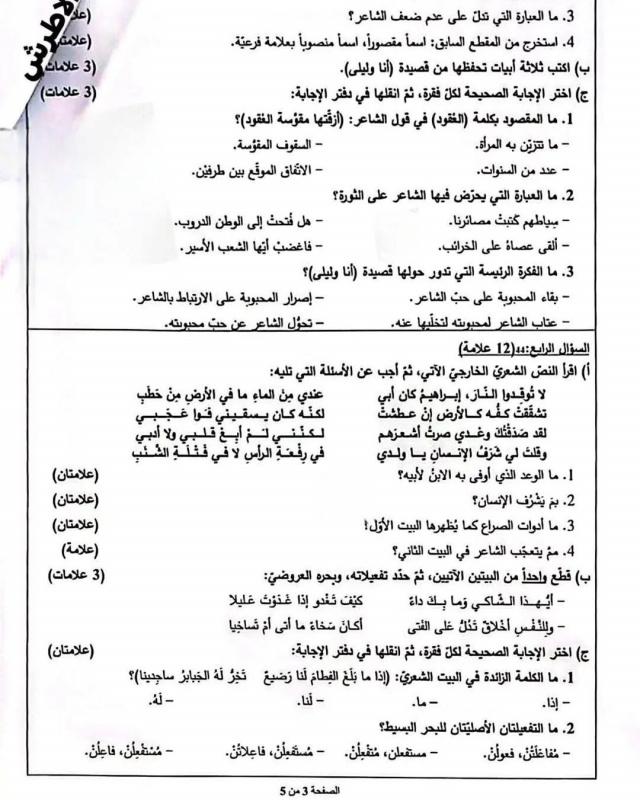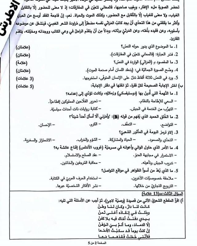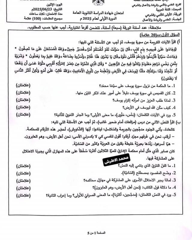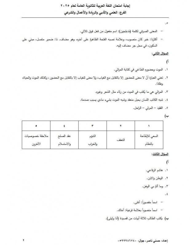 إجابات حل امتحان اللغة العربية للثانوية العامة توجيهي فلسطين 2025 إجابة العربي