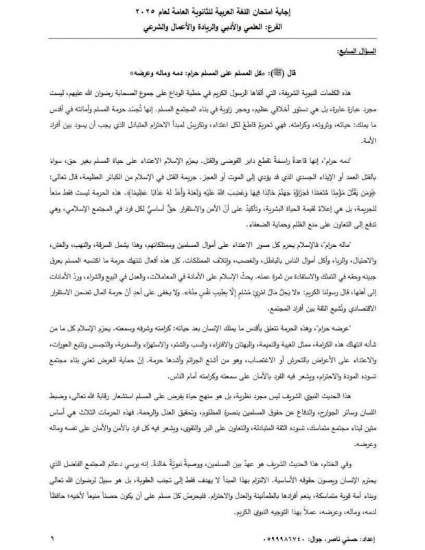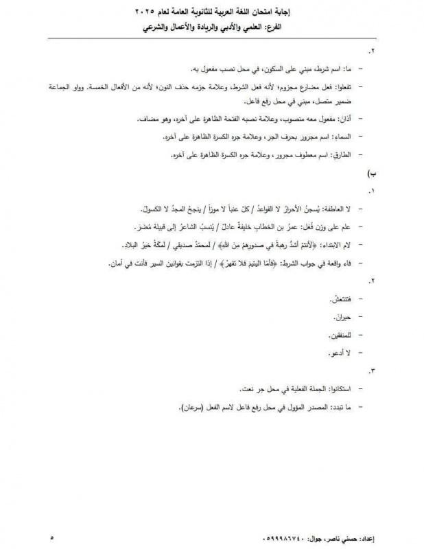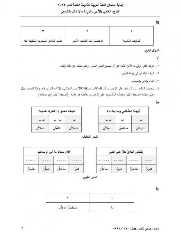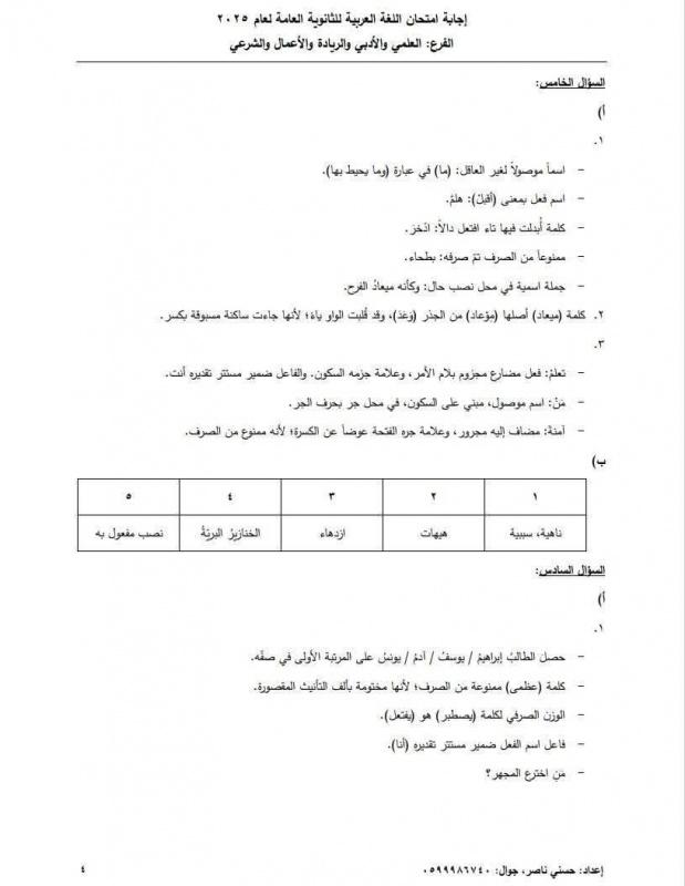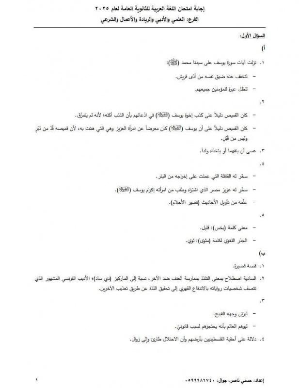إجابة امتحان العربي توجيهي فلسطين 2025