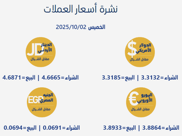 جاءت أسعار صرف العملات مقابل الشيقل الإسرائيلي، اليوم الخميس، بحسب سلطة النقد الفلسطينية، على النحو التالي: