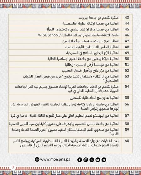 وقّعت وزارة التربية والتعليم العالي منذ مطلع العام 2025 سلسلة من الاتفاقيات ومذكرات التفاهم مع عدد من المؤسسات الدولية والمحلية، بهدف تعزيز وتطوير قطاعي التعليم العام والعالي في فلسطين.