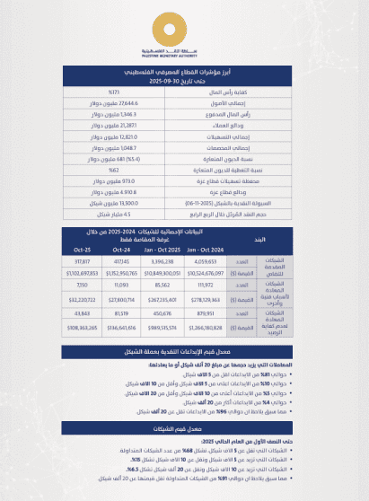 واستعرض الشنّار أبرز مؤشرات القطاع المصرفي الفلسطيني حتى تاريخ 30.9.2025، وجاءت كتالي: