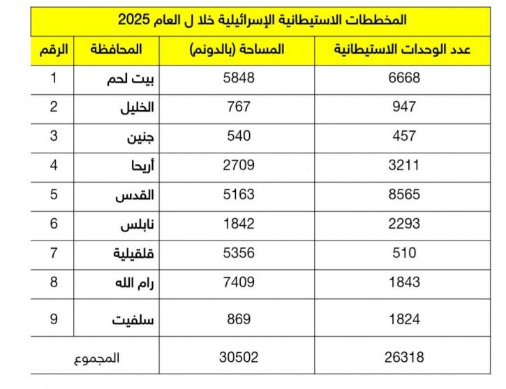 وأظهر المعهد في بياناته وإحصاءاته، أن المخططات الاستيطانية خلال العام الجاري على النحو التالي: