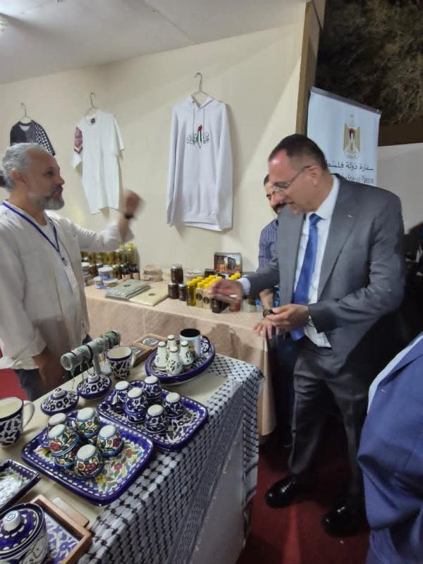 واستهل الرويضي زيارته بالجناح الفلسطيني، الذي تشرف عليه السفارة، ويضم مجموعة متنوعة من المعروضات التراثية، والأزياء والمطرزات، والأشغال الخزفية والخشبية، إضافة إلى المأكولات والحلويات الشعبية، إلى جانب عروض تراثية وشعبية.