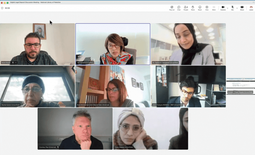 عقدت المكتبة الوطنية الفلسطينية، يوم أمس الاثنين، اجتماعًا دوليًا مع ممثلي أقسام المكتبات الوطنية في كل من مكتبة قطر الوطنية، والمكتبة الوطنية الاسكتلندية، والمكتبة الوطنية الفرنسية، وذلك ضمن إطار التعاون مع الاتحاد الدولي لجمعيات ومؤسسات المكتبات (الإفلا)، لبحث سبل تطوير نظام الإيداع القانوني ومواكبة التحولات الرقمية في عمل المكتبات الوطنية.