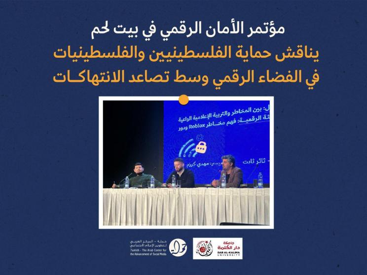 اختتم حملة - المركز العربي لتطوير الإعلام الاجتماعي، بالشراكة مع جامعة دار الكلمة، مؤتمر الأمان الرقمي الذي عُقد أمس الثلاثاء في حرم الجامعة بمدينة بيت لحم تحت عنوان "أمننا الرقمي مستقبلنا: الفضاء الرقمي بين الحرية والأمان" بمشاركة نخبة من الخبراء والخبيرات والحقوقيين/ات والباحثين/ات في قضايا الحقوق الرقمية، وحضور ما يقارب 200 مشارك/ة من طلبة الجامعات والنشطاء/الناشطات والمهتمين/ات بالحقوق الرقمية. وجاء المؤتمر في ظل تصاعد الانتهاكات الرقمية بحق الفلسطينيين/ات وتنامي المخاطر التي تهدد سلامتهم/ن وحقوقهم/ن في الفضاء الرقمي، لا سيّما ما يتعلق بسلامة الأطفال، والعنف الرقمي القائم على النوع الاجتماعي، والحق في الخصوصية والتعبير، إلى جانب بحث سبل الحماية والمناصرة وبناء سياسات رقمية عادلة وآمنة.