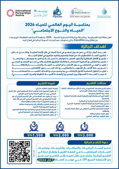 في إطار دعم وتمكين المرأة الفلسطينية في أحد أهم القطاعات الحيوية، أطلقت سلطة المياه بالتعاون مع الوكالة النمساوية للتنمية ومنظمة اليونيسيف جائزة “المرأة والمياه ”AquaShe –، وذلك ضمن الفعاليات التحضيرية لإحياء اليوم العالمي للمياه 2026، الذي يأتي هذا العام تحت شعار “المياه والنوع الاجتماعي”.
