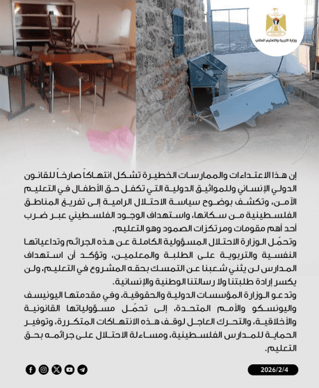 وتحمّل الوزارة الاحتلال المسؤولية الكاملة عن هذه الجرائم وتداعياتها النفسية والتربوية على الطلبة والمعلمين، وتؤكد أن استهداف المدارس لن يثني شعبنا عن التمسك بحقه المشروع في التعليم، ولن يكسر إرادة طلبتنا ولا رسالتنا الوطنية والإنسانية.