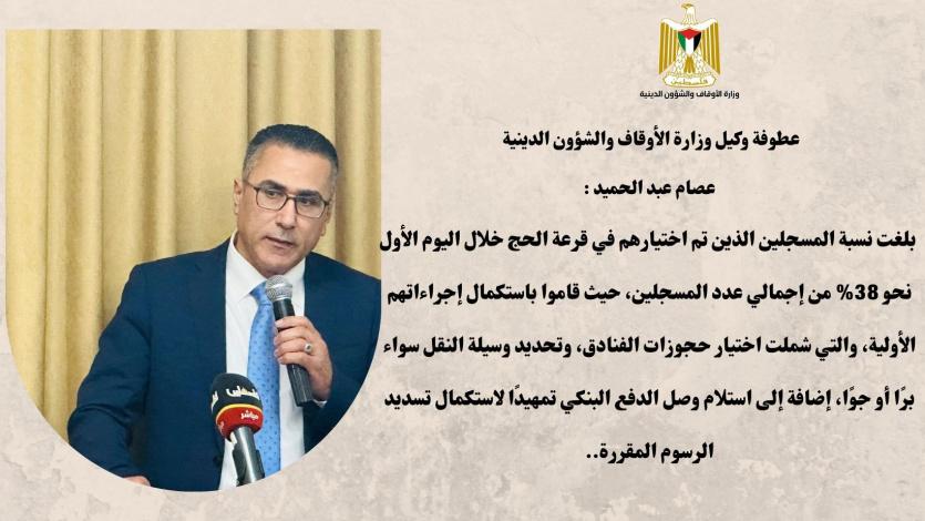 أعلنت وزارة الأوقاف والشؤون الدينية أن عدد الحجاج الذين راجعوا مديريات الاوقاف يوم أمس في كافة المحافظات الشمالية (الضفة الغربية القدس)، واستكملوا تسجيلهم بلغ (1408) حاجاً بنسبه 38٪ من الذين تم اختيارهم بموجب القرعة التي أجرتها الوزارة الخميس الماضي وقاموا باختيار حجوزات الفنادق واختيار وسيلة النقل بين البر والجو واستلموا وصل الدفع البنكي لاستكمال تسديد الرسوم.