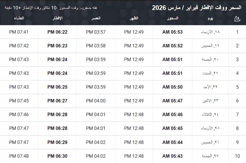 أذان الفجر (الإمساك): 04:45 صباحاً.