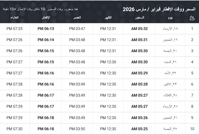 وقت الإمساك: قبل أذان الفجر بـ 10 دقائق لضمان الاستعداد للصيام.