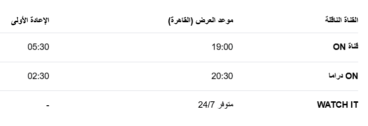 قناة ON E: العرض الأول في تمام الساعة 7:00 مساءً بتوقيت القاهرة.