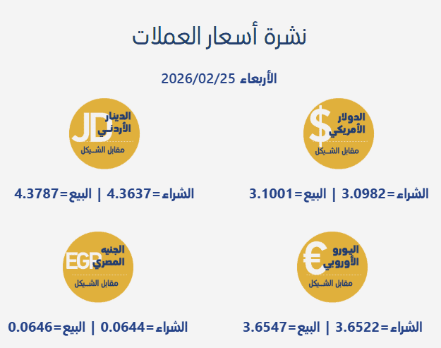 جاءت أسعار صرف العملات مقابل الشيقل الإسرائيلي، اليوم الأربعاء، بحسب سلطة النقد الفلسطينية، على النحو التالي: