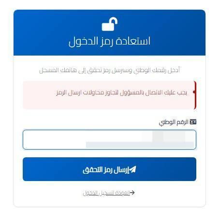 ج: اضغط على جملة "نسيت رمز الدخول" في الصفحة الرئيسية، أدخل رقمك الوطني، وسيصلك كود (OTP) على هاتفك. بعد إدخال الكود، سيظهر الرمز الجديد على الشاشة مباشرة؛ تأكد من تصويره أو كتابته فوراً لأنه لن يصلك في رسالة نصية.