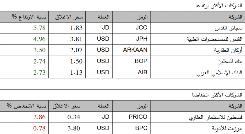 وحسب تقرير لبورصة فلسطين، فقد شهدت جلسة اليوم تداولات بلغت قيمتها 92,953 دولار، فيما بلغ الحجم الإجمالي للأسهم المتداولة 50,789 سهما، وشهد السوق اليوم 54 صفقة.
