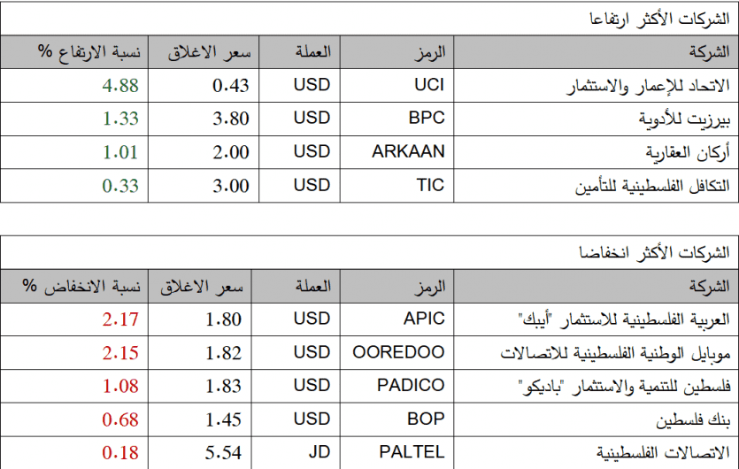 وأغلق مؤشر القدس لجلسة اليوم منخفضاً بمقدار 3.30 نقطة، بنسبة بلغت 0.52% عن إغلاق الجلسة السابقة، ليغلق عند مستوى 626.28 نقطة، وأغلق مؤشر القدس الإسلامي منخفضاً هو الآخر بنسبة 0.03%، فيما شهدت جلسة اليوم تداول 13 شركة، حيث ارتفعت أسهم 4 شركات، في المقابل انخفضت أسعار أسهم 5 شركات، واستقرت أسعار أسهم 4 شركات أخرى.
