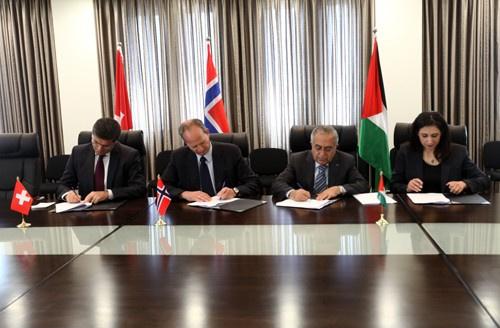 وقع عن الجانب النرويجي ممثل النرويج لدى السلطة الوطنية هانس فريدنلوند، وعن الجانب السويسري ممثل سويسرا لدى السلطة الوطنية رولاند ستنغر، وبحضور مدير الوكالة السويسرية للتنمية والتعاون جان كارلو.