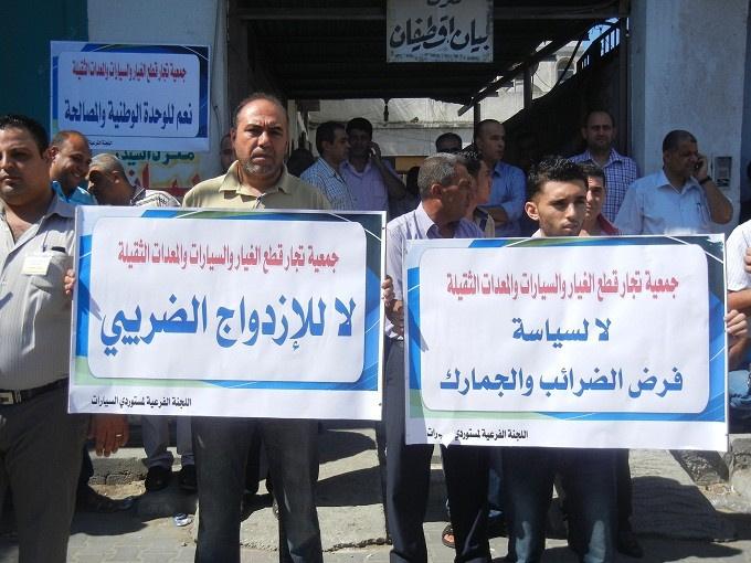اعتصم العشرات من تجار ومستوردي السيارات بقطاع غزة تلبية لدعوة من قبل جمعية أصحاب السيارات بغزة للإضراب بشكل جزئي اليوم الثلاثاء احتجاجاً على قرار الحكومة المقالة بغزة فرض قيمة 25% رسوم جمركية إضافية على السيارات المدخلة عبر معبر كرم أبو سالم.