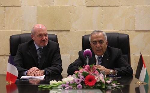 وقع رئيس الوزراء سلام فياض، والحكومة الفرنسية ممثلة بالقنصل العام الفرنسي في القدس فرديريك ديزانيو، اليوم الأحد، اتفاقية منحة بقيمة 10 ملايين يورو، دعما لموازنة السلطة الوطنية للعام 2012.