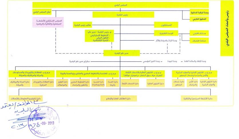 وأوضح العويوي ان اقرار المخطط الهيكلي الذي يوضح مسارات العلاقة بين الدوائر والأقسام المختلفة وتحديد المسؤوليات سيضمن سلاسة العمل ونجاعته وتحقيق اعلى مستويات النجاح الاداري المنعكس بشكل مباشرة على مستوى الخدمة المقدمة للمواطن على الشكل الامثل و يحقق تطلعات رئيس و اعضاء المجلس البلدي في توجهاتهم التطويرية