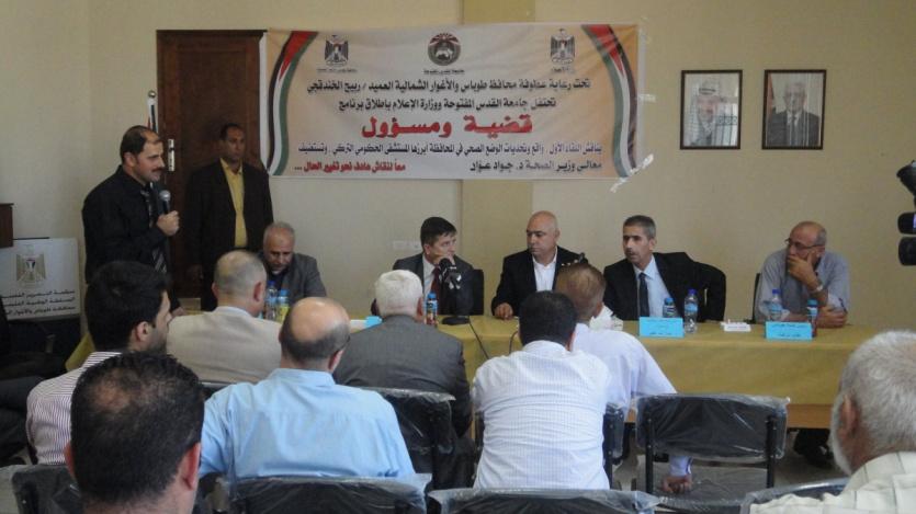 واستهل منسق وزارة الإعلام في طوباس، عبد الباسط خلف، البرنامج بالقول: إن الوزارة، منذ تأسيسها، تخلق فضاءات لجمع المسؤولين بممثلي وسائل الإعلام، وبالمواطنين والمهتمين، وتكون همزة وصل تؤسس لثقافة الحوار، وتكرس مبدأ الحق في الحصول على المعلومة من أصحاب القرار وصناعه ومسؤوليه.