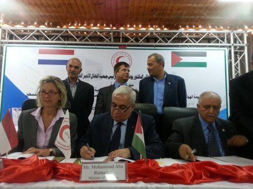 وقّع وزير الدولة لشؤون التخطيط محمد أبو رمضان، وممثلة هولندا لدى دولة فلسطين 'بيرجيتا تازلار'، اليوم الخميس، اتفاقية بقيمة 10 مليون يورو، لدعم مشروع جمعية الهلال الأحمر الفلسطيني الممول من قبل برنامج (ORIO) 'الصندوق العالمي للبنية التحتية الممول من هولندا'، بهدف تجهيز وتوسعة مستشفى الهلال الأحمر التخصصي للأطفال والولادة في الخليل.