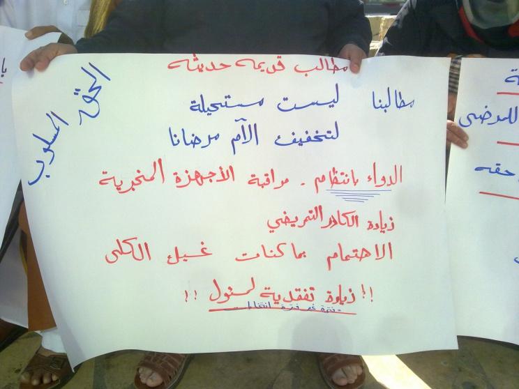 يشار أن مرضى غسيل الكلى نظموا عددا من الوقفات الاحتجاجية خلال الشهور الست الأخيرة للمطالبة بتوفير ابر الايبركس وماكنات الغسيل وغيرها من الاحتياجات اللازمة، حيث تلقوا وعودات كثيرة عبر وسائل الإعلام المختلفة إلا أن المشكلة ما زالت قائمة والخطر يهدد حياتهم.