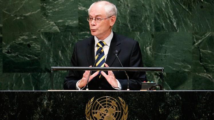 وقال فان رومبوي في كلمة أمام الجمعية العامة للأمم المتحدة إن الاتحاد الأوروبي مستعد لإعادة النظر في العقوبات المفروضة ضد روسيا وتعزيز أجواء الثقة مع موسكو إذا ما تم إحراز تقدم في تنفيذ اتفاق مينسك لتسوية أزمة أوكرانيا، وأكد أن الاتحاد الأوروبي مستعد للتعاون مع روسيا التي وصفها بالجار الأكبر.
