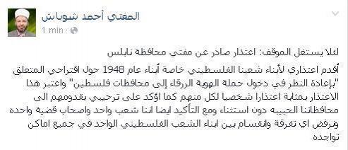 أعتذر مفتي محافظة نابلس الشيخ أحمد شوباش اليوم الثلاثاء، عن تصريحه الذي صدر عنه مؤخراً والقاضي باقتراح منع دخول الفلسطينيين من حملة الهوية الزرقاء إلى مناطق الضفة الغربية.
