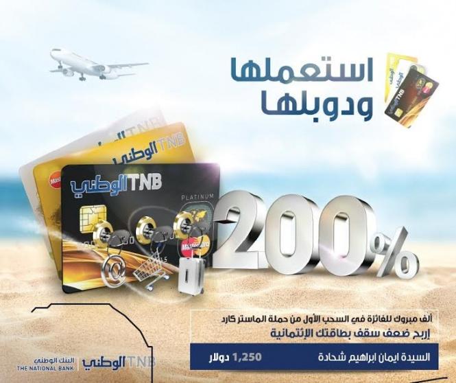 أعلن البنك الوطني اليوم عن نتيجة السحب الأول في حملة "دوبلها" الخاصة بمستخدمي بطاقته الائتمانية، وفازت السيدة ايمان شحادة من فرع الإرسال بضعف سقف بطاقتها، بعد فوز احدى الحركات التي اجرتها على بطاقتها في السحب الأول.