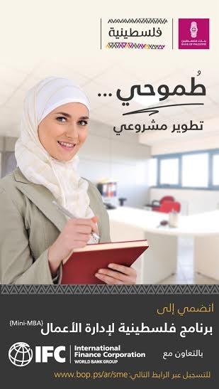 أعلن بنك فلسطين عن بدء استقبال الطلبات لبرنامجه الجديد تحت عنوان برنامج "فلسطينية لإدارة الأعمال" Mini MBA الذي اطلقه بالتعاون مع مؤسسة التمويل الدولية IFC. حيث أن هذا البرنامج يأتي ضمن برنامج البنك الرئيسي لدعم النساء الفلسطينيات "فلسطينية". و يهدف البرنامج الى تطوير مهارات العمل والقيادة للنساء الرياديات وصاحبات الأعمال، وتحفيز وتطوير النساء القياديات للشركات الصغيرة والمتوسطة في فلسطين من خلال تطوير مهاراتهن في مجالات مختلفة، منها؛ التخطيط الاستراتيجي والمالي، والتسويق، وإدارة الموارد البشرية، وغيرها. كما يقوم البرنامج على تطوير المهارات القيادية للمرأة، وتشبيكها مع خبراء دوليين ومحليين. وبخصوص بعض الفعاليات والدورات المرتبطة بهذا البرنامج سيجري تنفيذها بالتعاون مع منتدى سيدات الأعمال وشركة أرنست أند يونغ. وسيتم اختيار أفضل 20 سيدة من مناطق القدس والضفة الغربية وأفضل 20 سيدة من قطاع غزة للاشتراك في البرنامج الذي ستكون مدته خمسة أشهر.