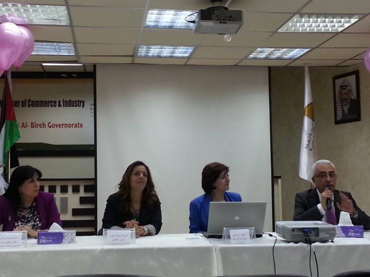 نظمت غرفة تجارة وصناعة رام الله والبيرة ومركز دنيا لاورام السرطان وبالتعاون مع جمعية الشابات المسيحية لقاء توعويا حول "الكشف المبكر عن اورام الثدي" وذلك في الغرفة التجارية والصناعية برام الله اليوم الخميس.