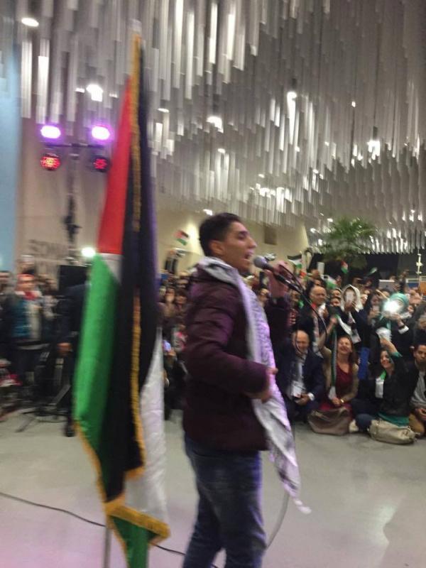 واقتصر الحفل على اغنيتين وطنيتين احتراما لشهداء فلسطين، وما يجري في الاراضي الفلسطينية.